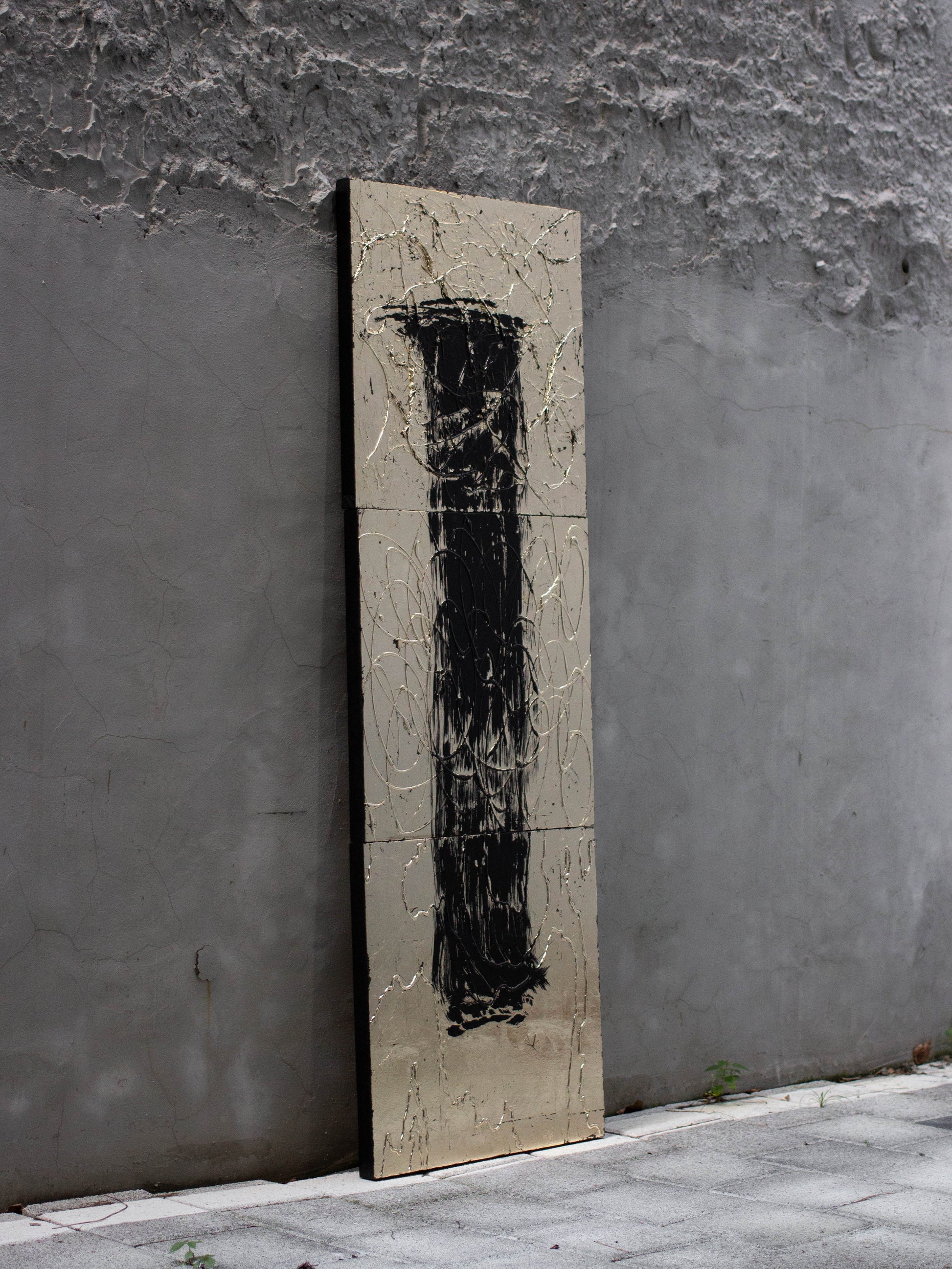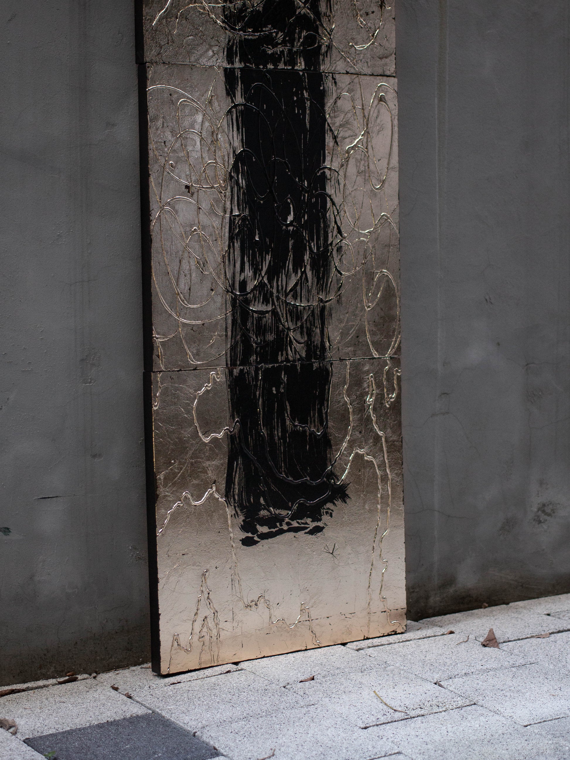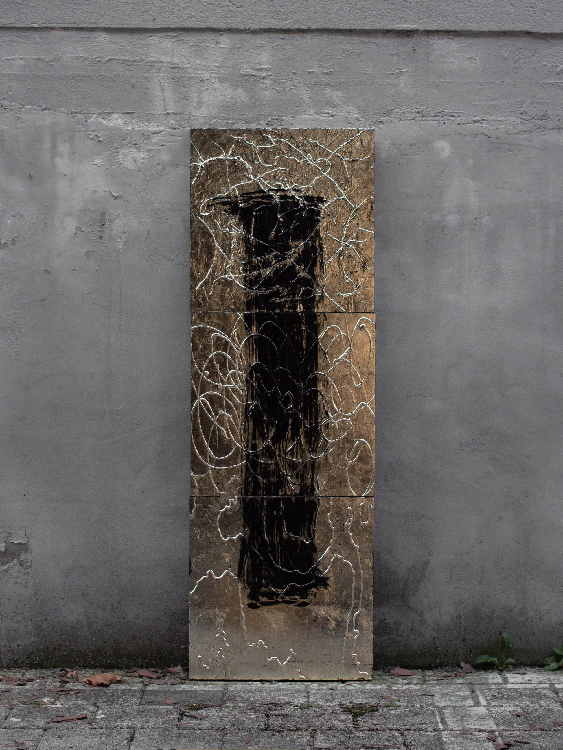 An abstract artwork composed of three wooden panels with distinct textures, unified by a golden leaf surface and a single vertical calligraphic line.