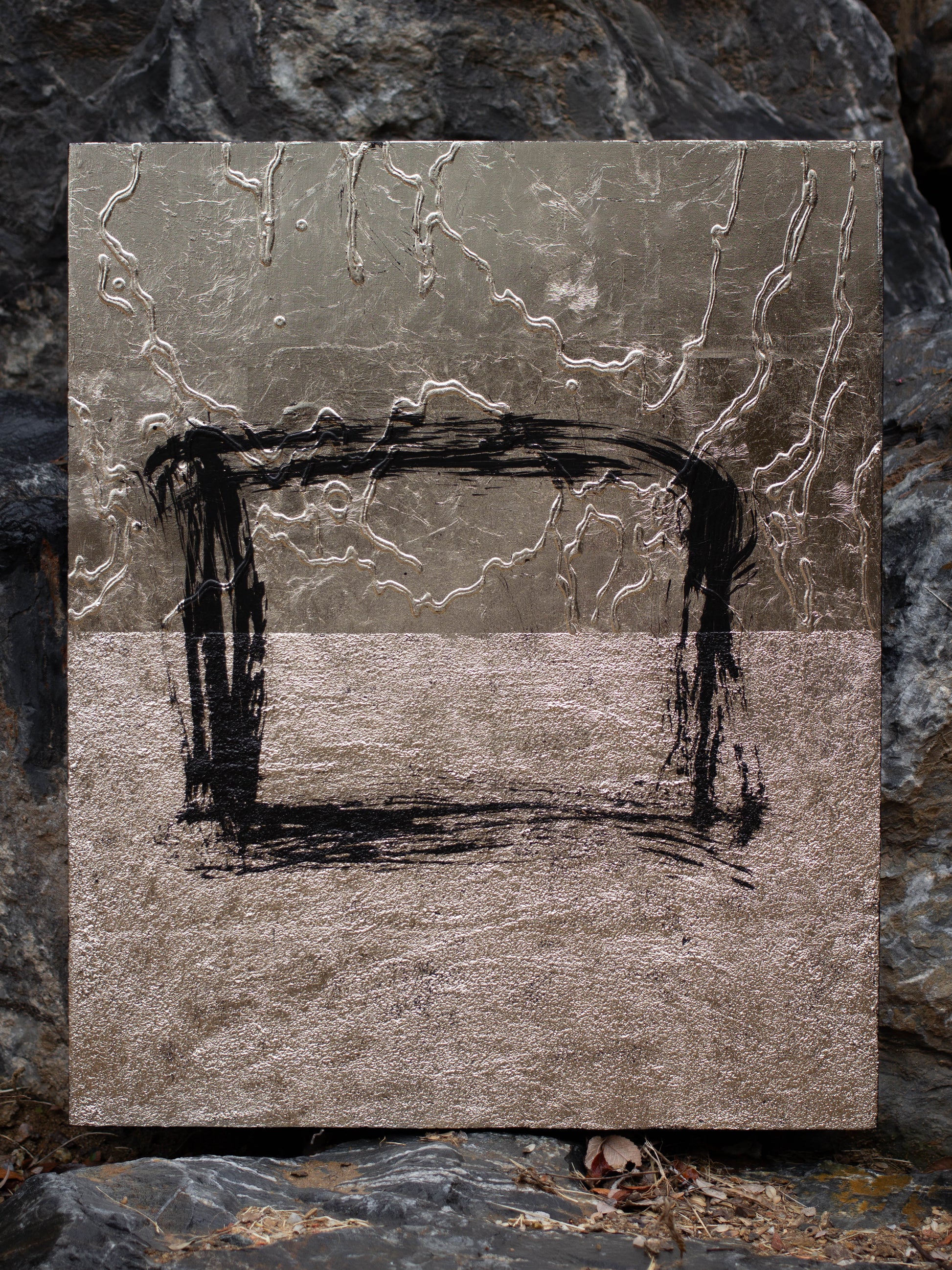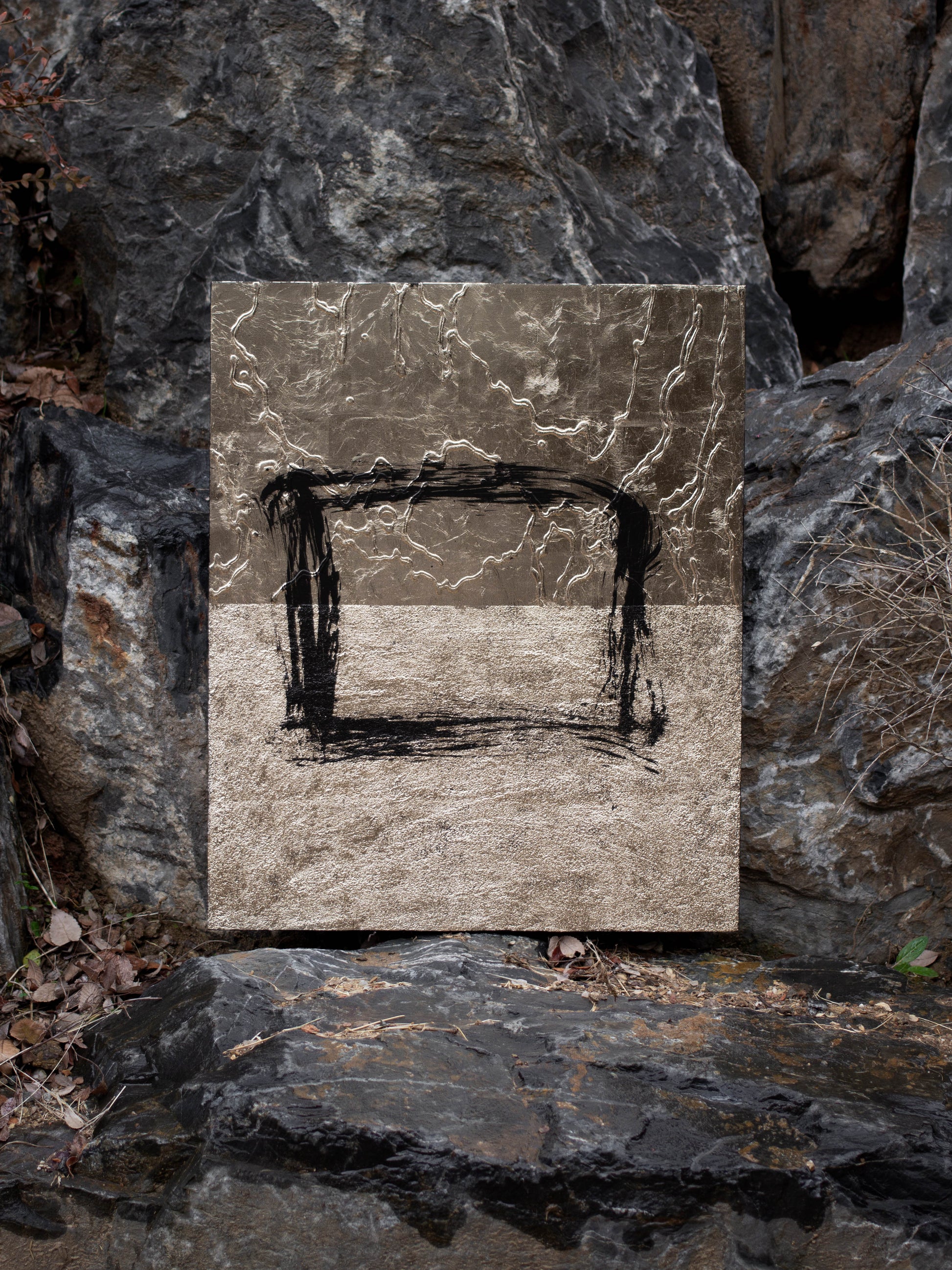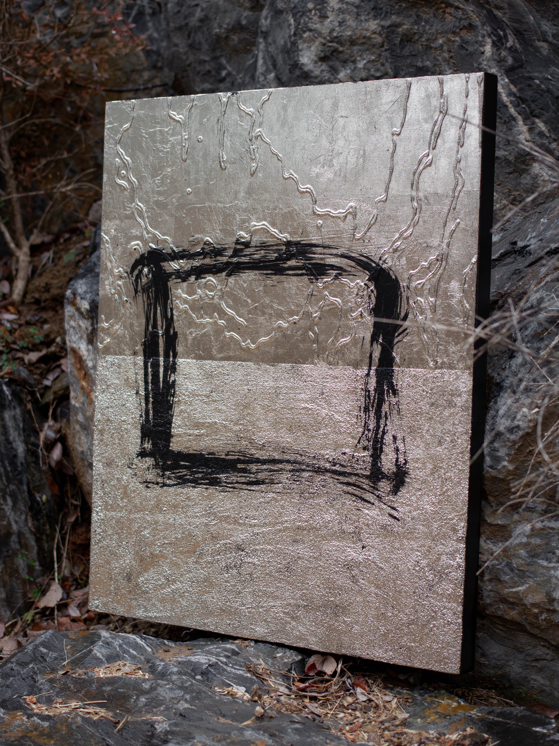 서로 다른 두 가지 질감을 지닌 하나의 패널 위에 한국어 자모 ‘ㅁ’을 중심으로 구성된 추상 작품이다.