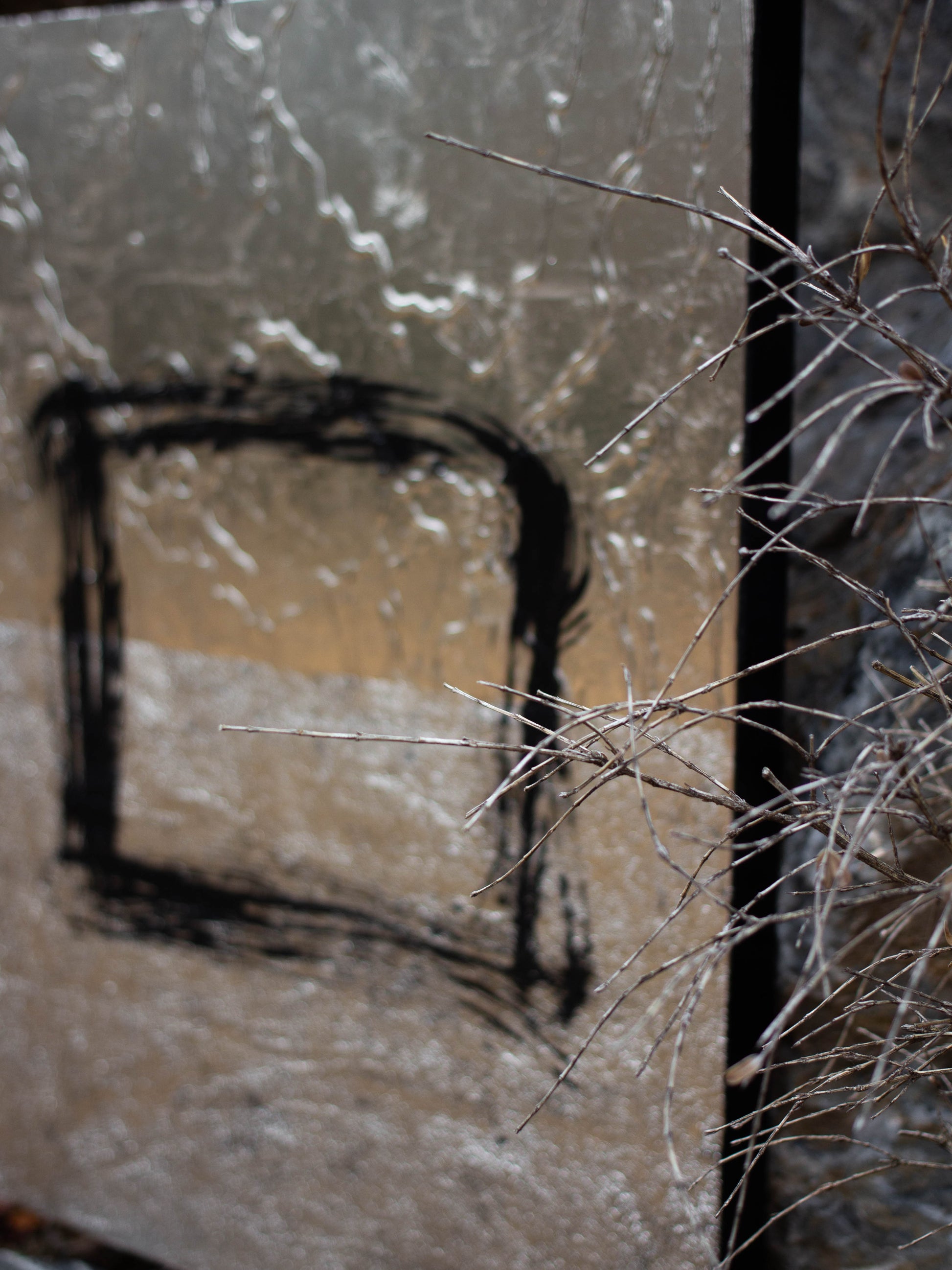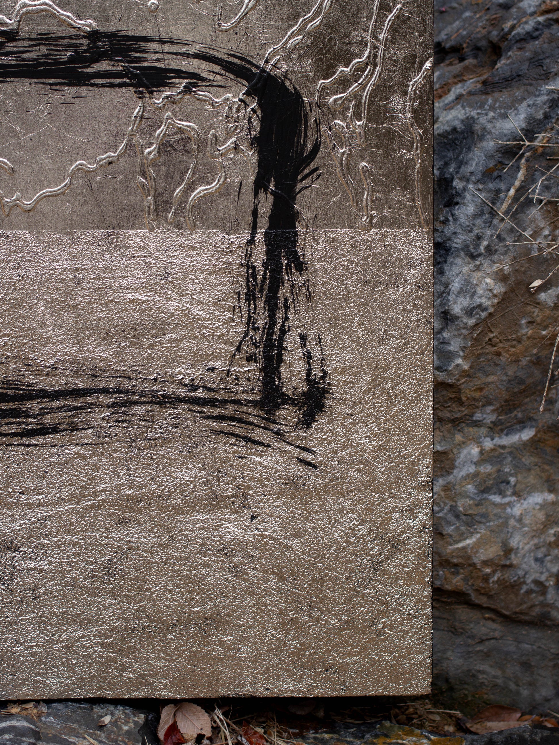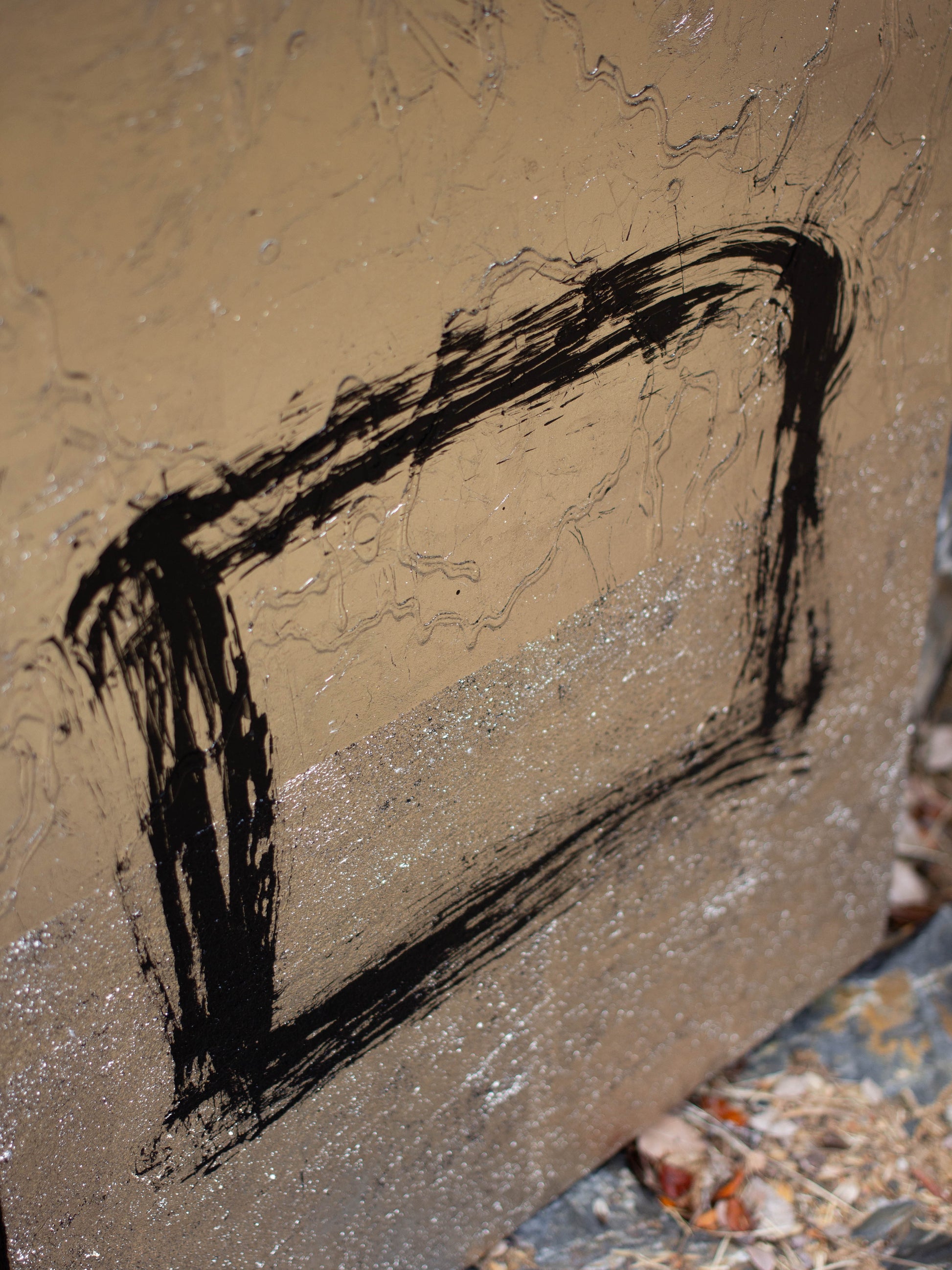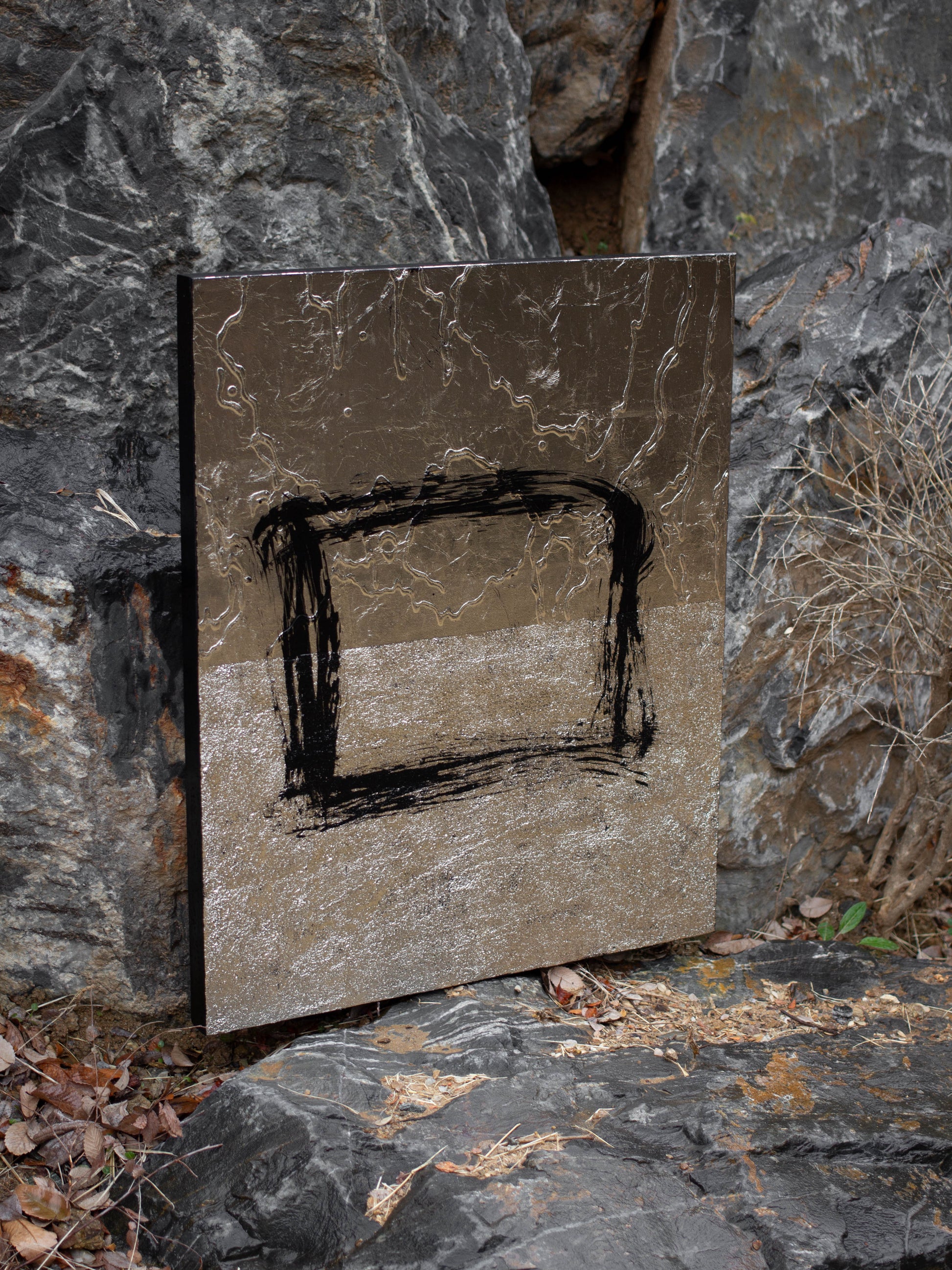 서로 다른 두 가지 질감을 지닌 하나의 패널 위에 한국어 자모 ‘ㅁ’을 중심으로 구성된 추상 작품이다.