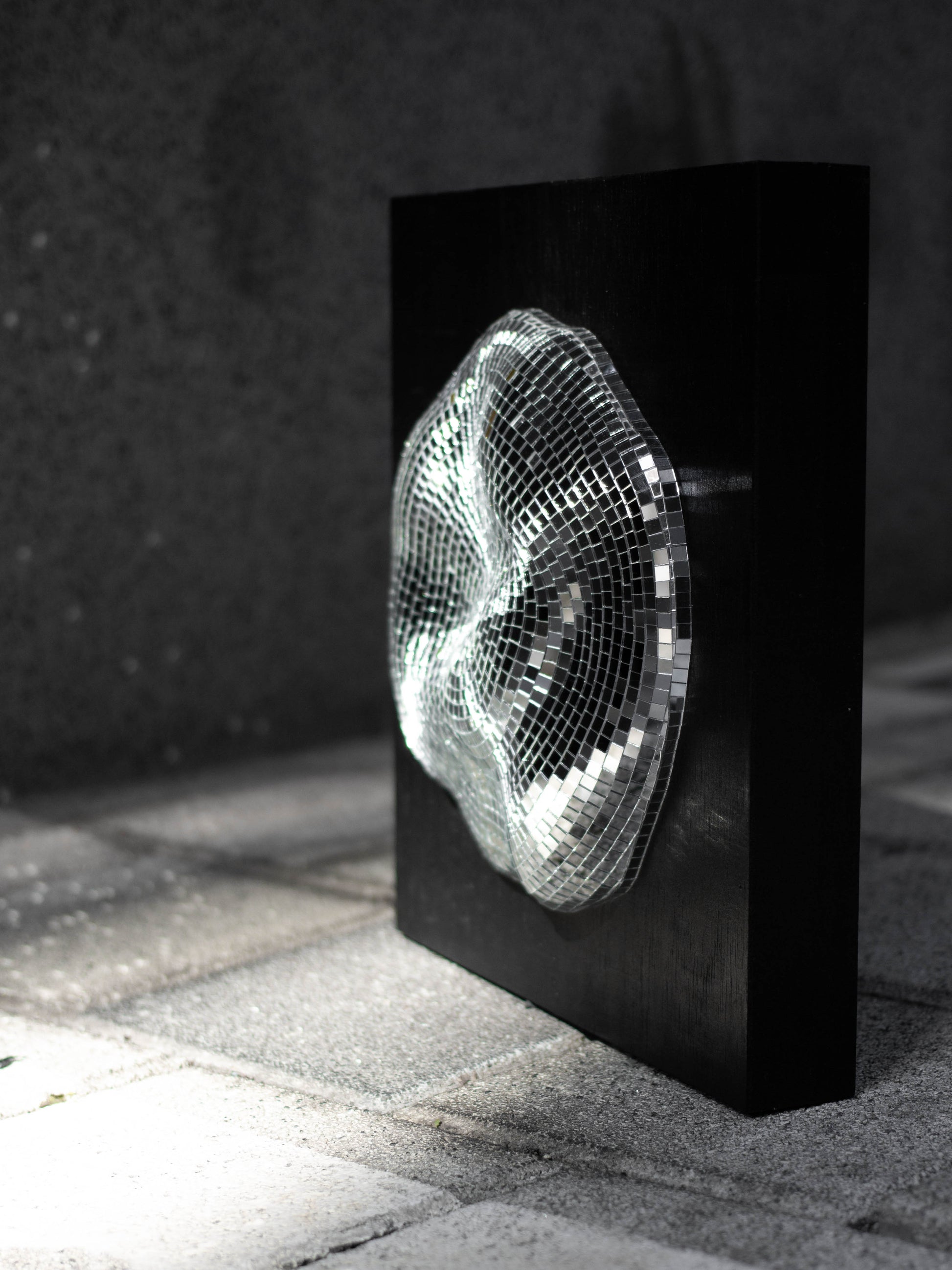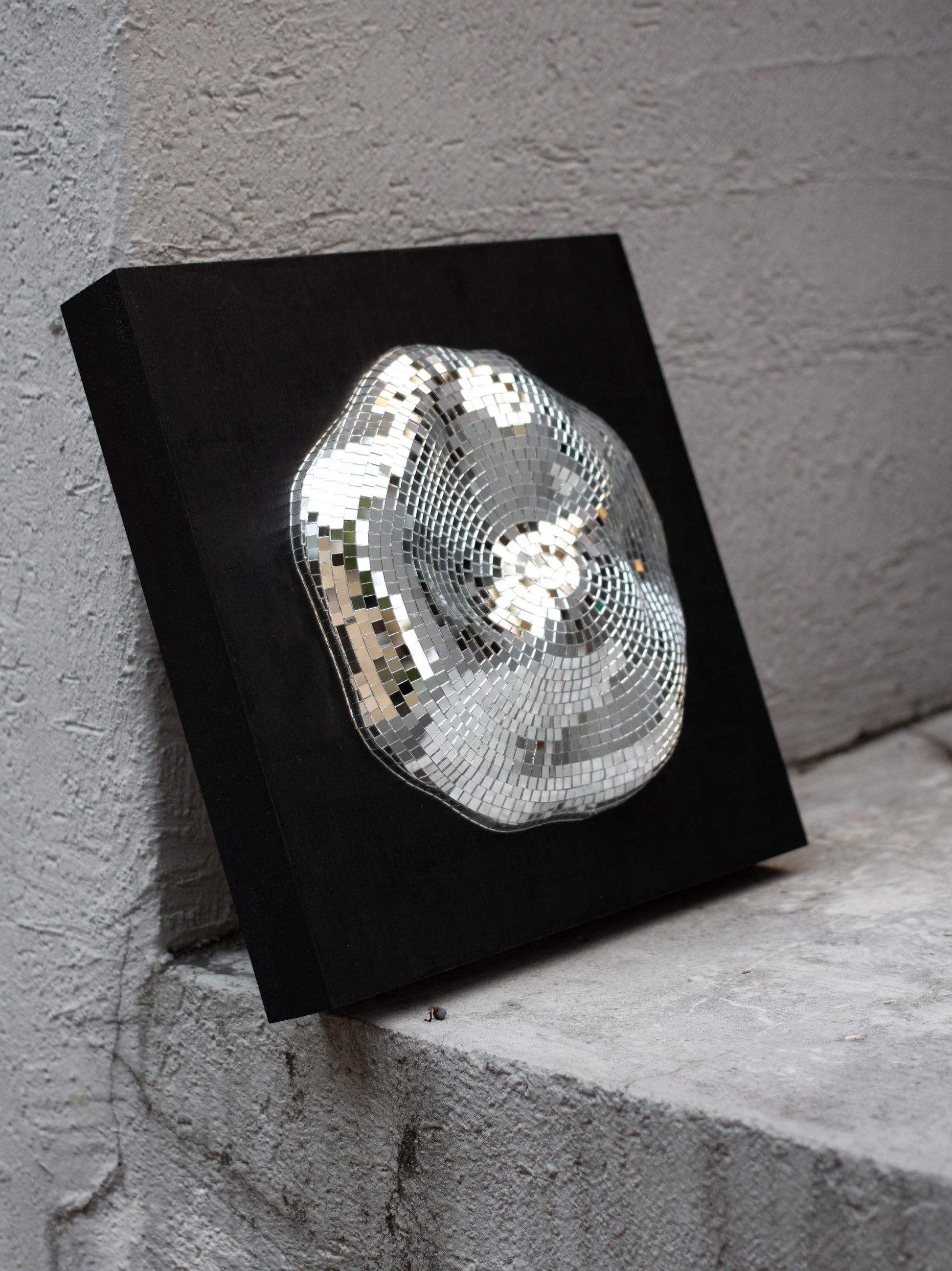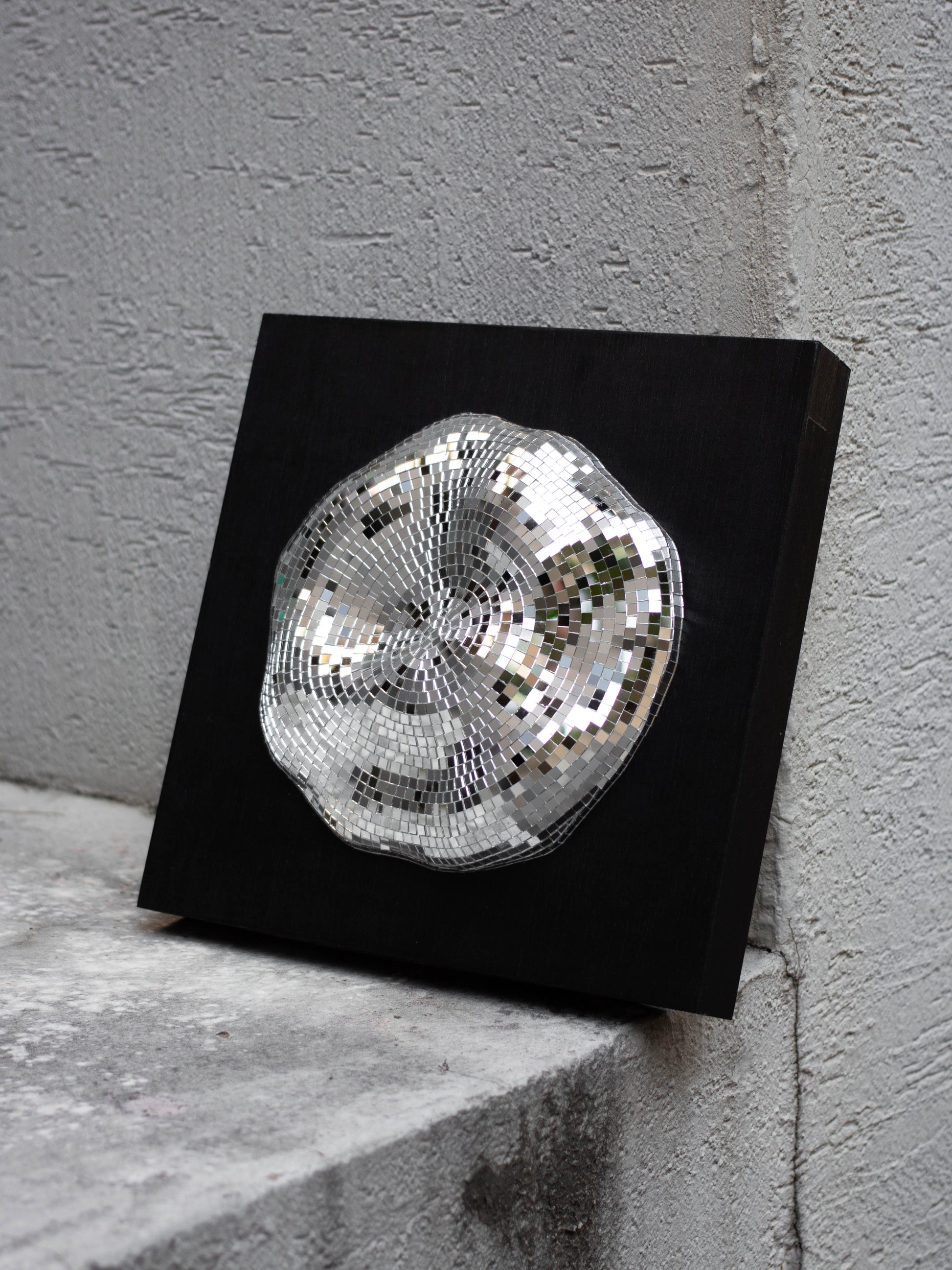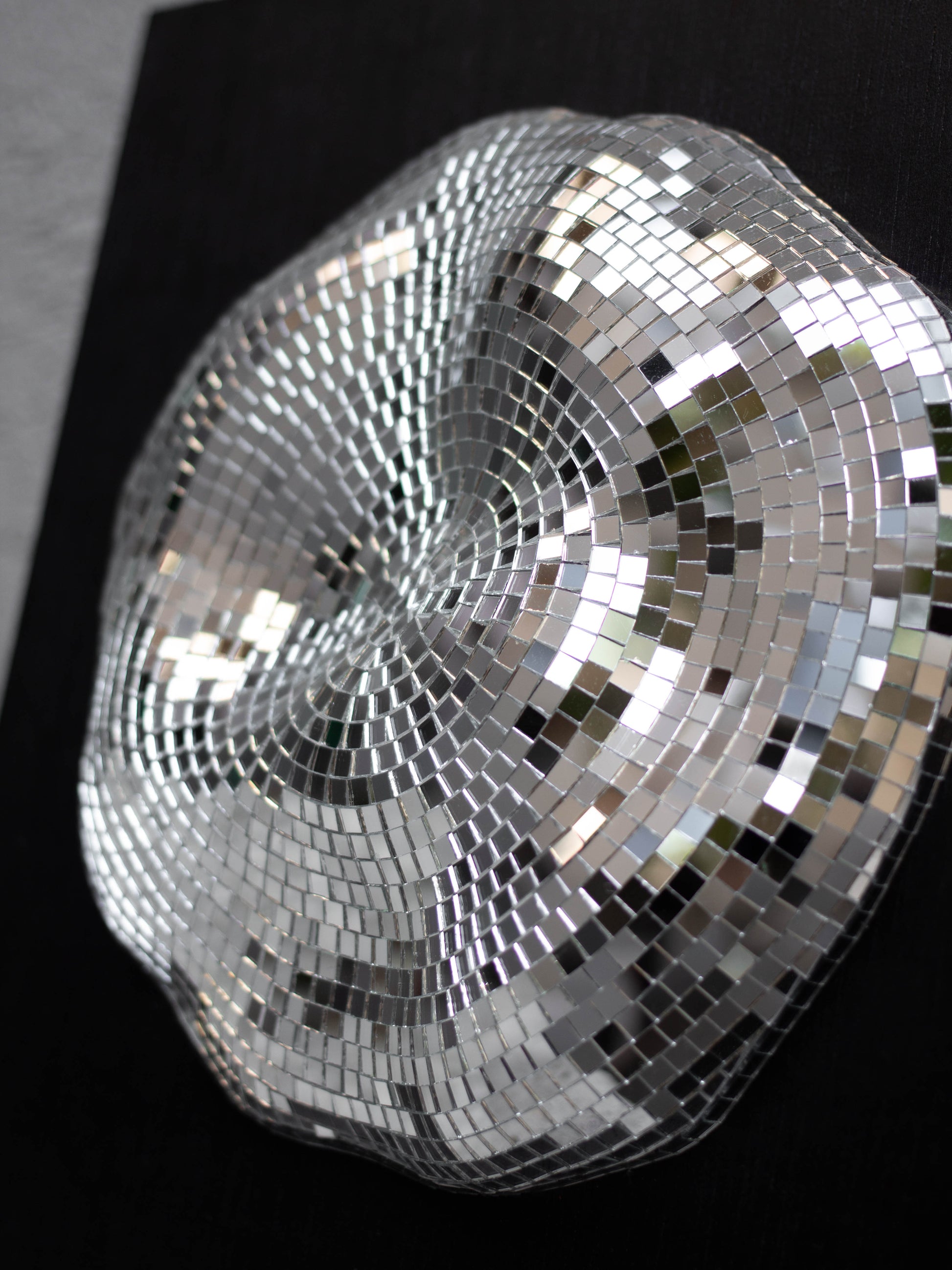 This work features a wavy, spherical form made of mirrored disco tiles, mounted on a deep black wooden panel. The mirrors fragment and reflect their surroundings, suggesting both implosion and expansion — a moment of inevitable change frozen in time.