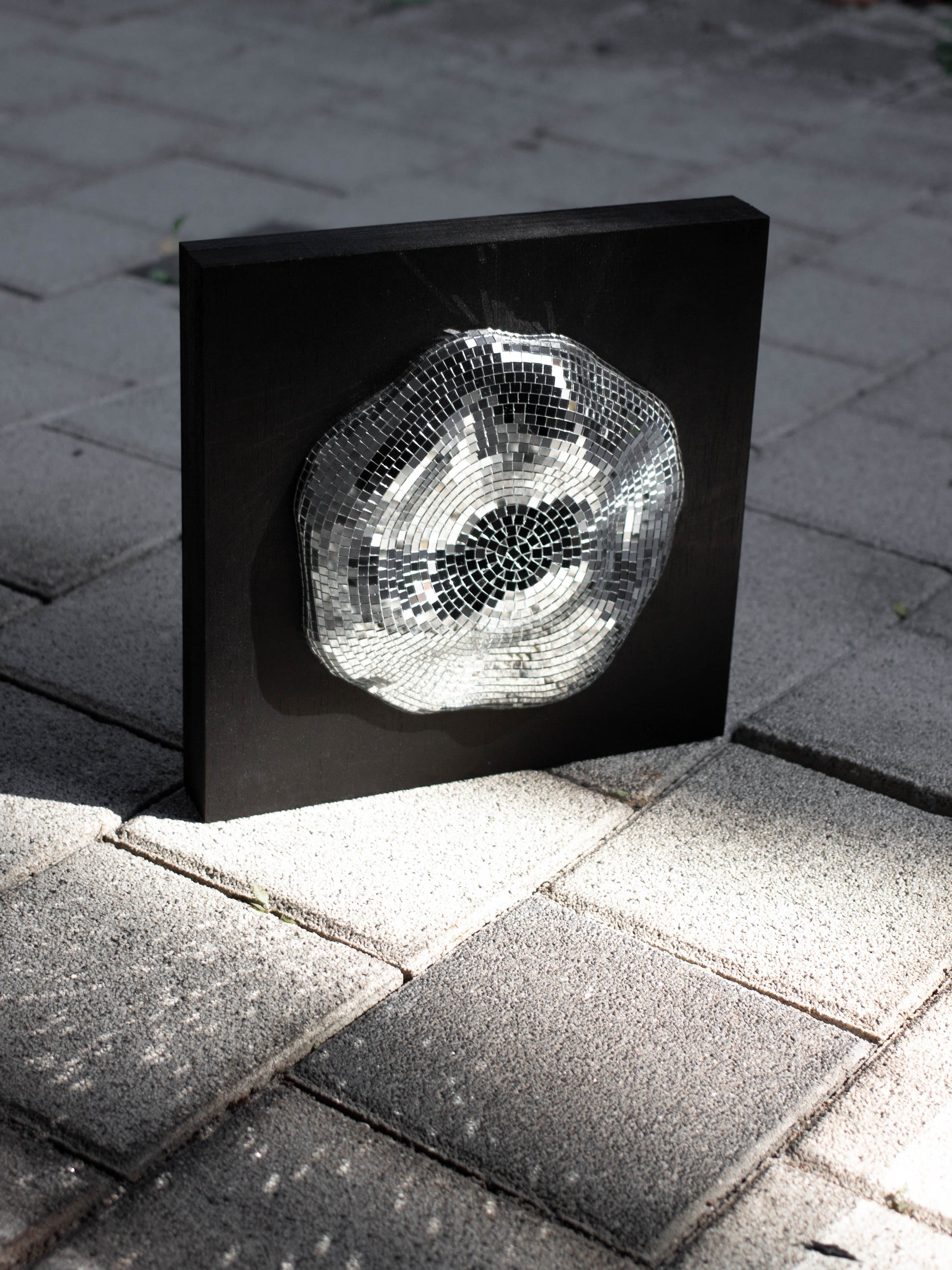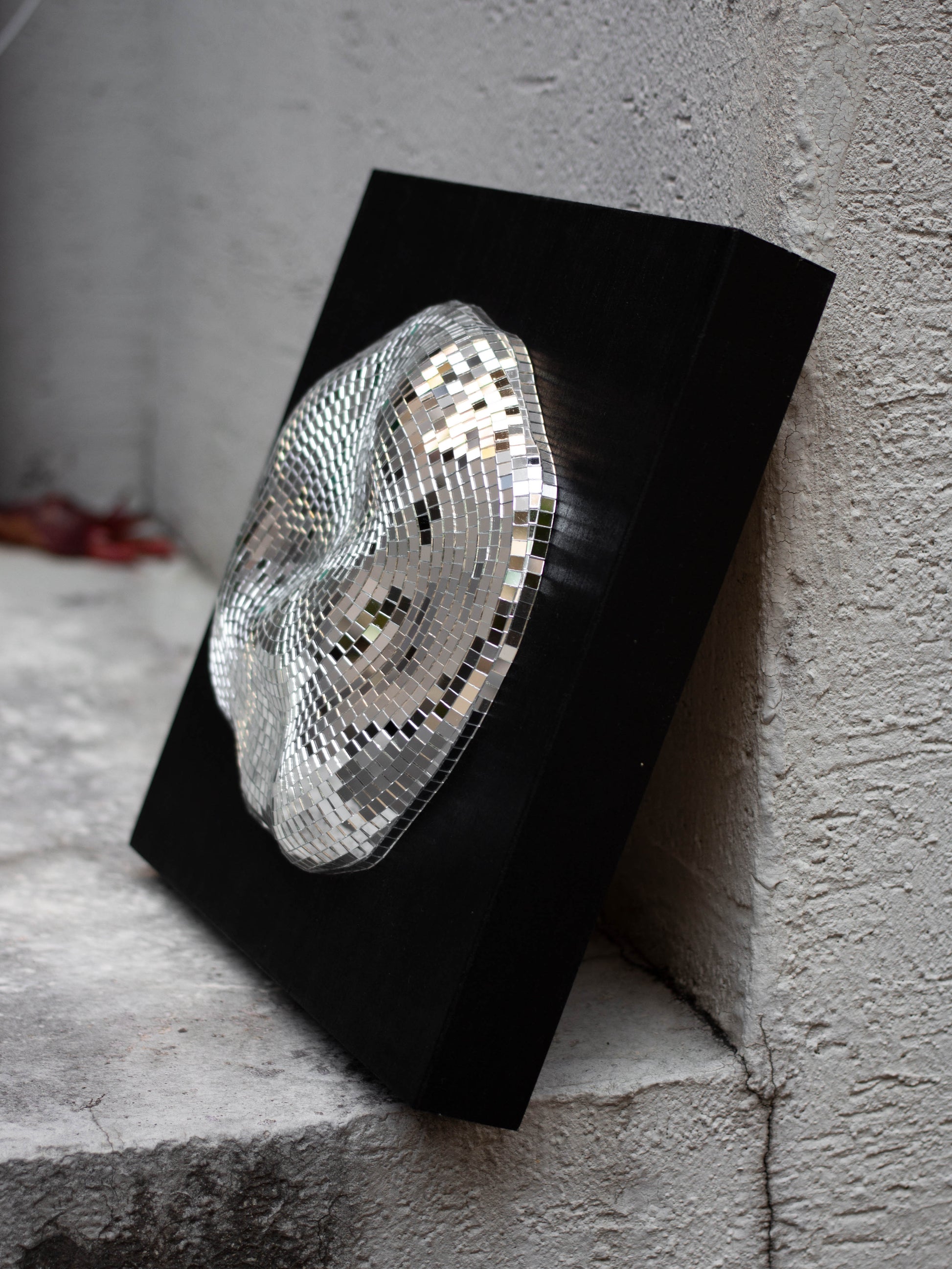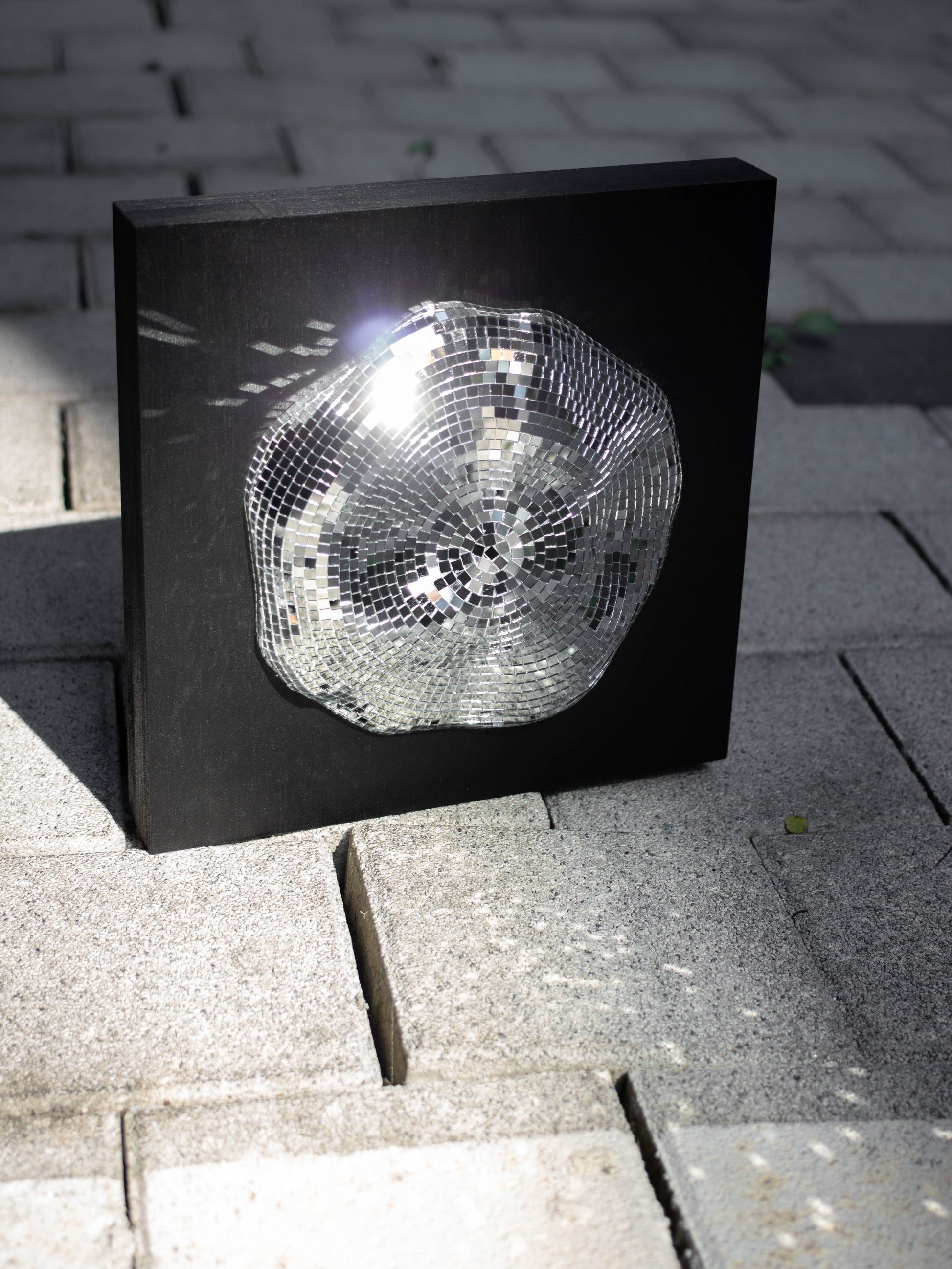 This work features a wavy, spherical form made of mirrored disco tiles, mounted on a deep black wooden panel. The mirrors fragment and reflect their surroundings, suggesting both implosion and expansion — a moment of inevitable change frozen in time.