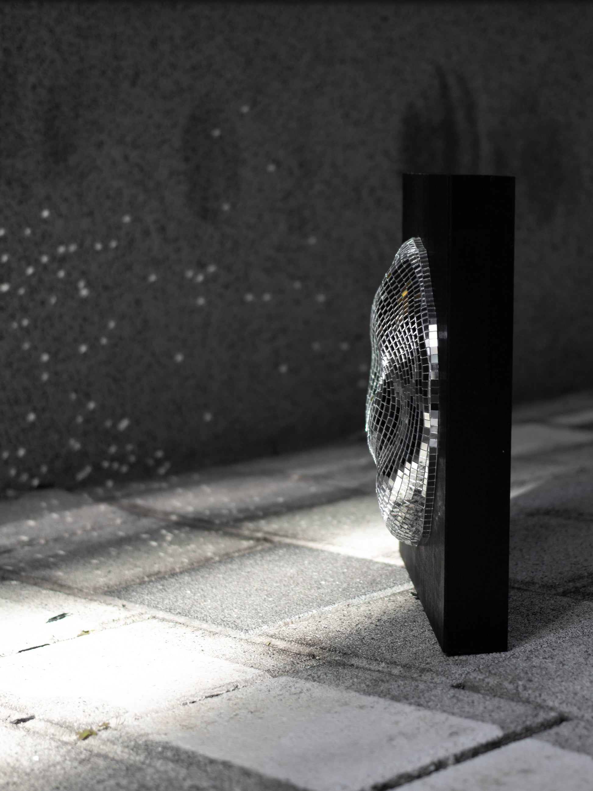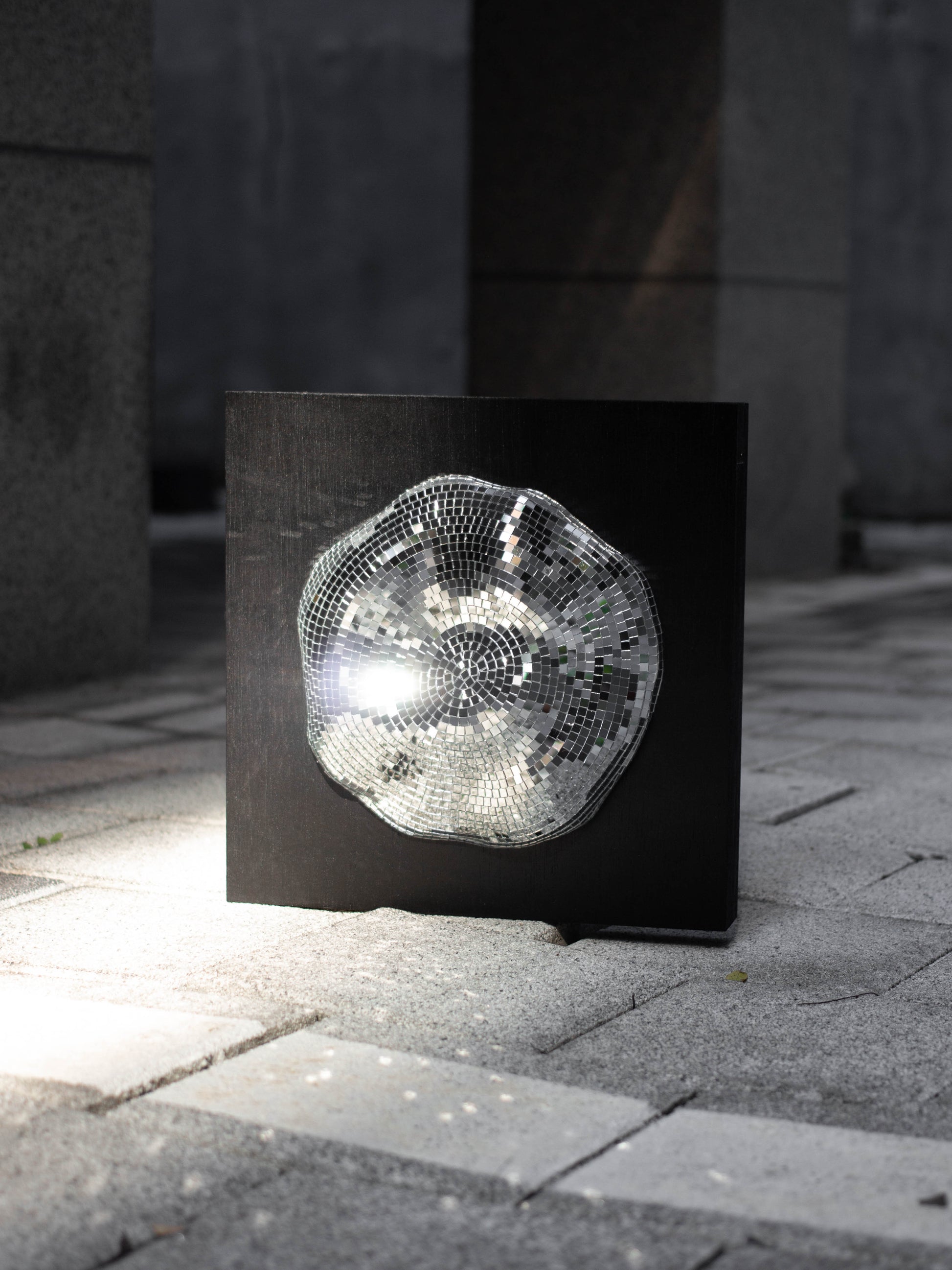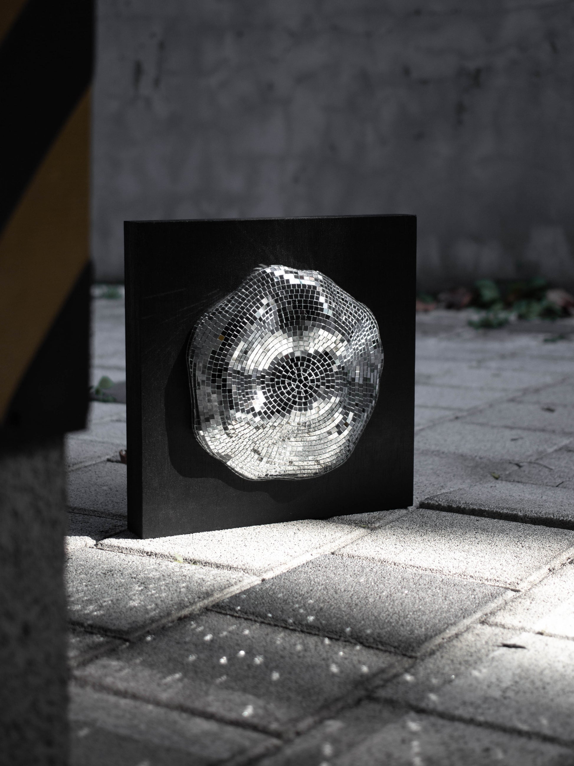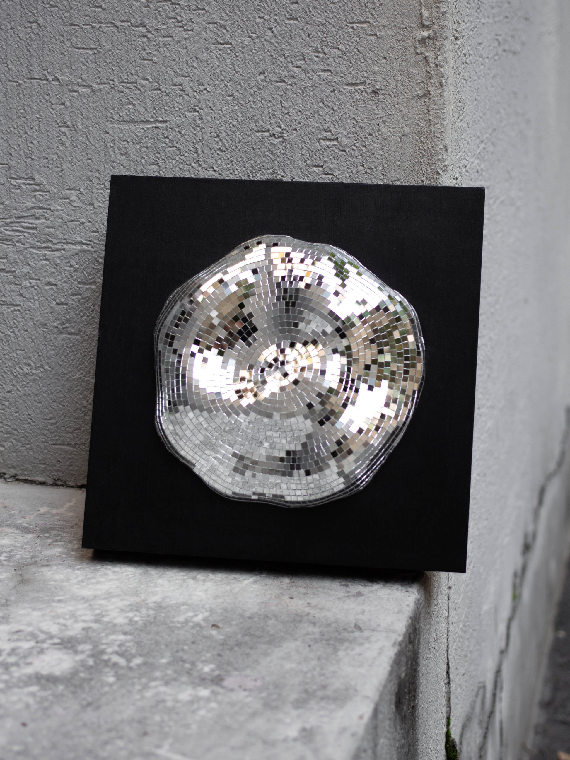 This work features a wavy, spherical form made of mirrored disco tiles, mounted on a deep black wooden panel. The mirrors fragment and reflect their surroundings, suggesting both implosion and expansion — a moment of inevitable change frozen in time.